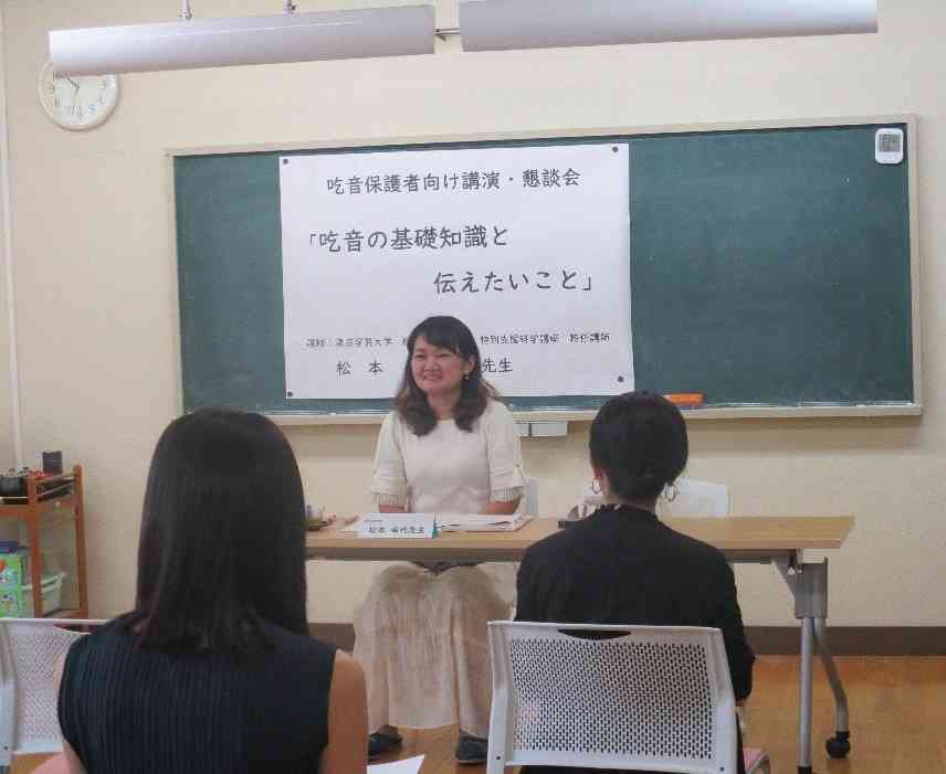 6月27日に東京学芸大学の松本幸代先生をお招きし、吃音児童の保護者向け講演会と懇談会を行いました。 吃音に関する基礎的な知識だけでなく、すぐに生かすことのできる子供への関わり方について講演をしていただきました。また、懇談会では保護者の方々の日頃の悩みや思いなどを共有し合いながら、松本先生から助言をいただくことができ、とても温かい会となりました。