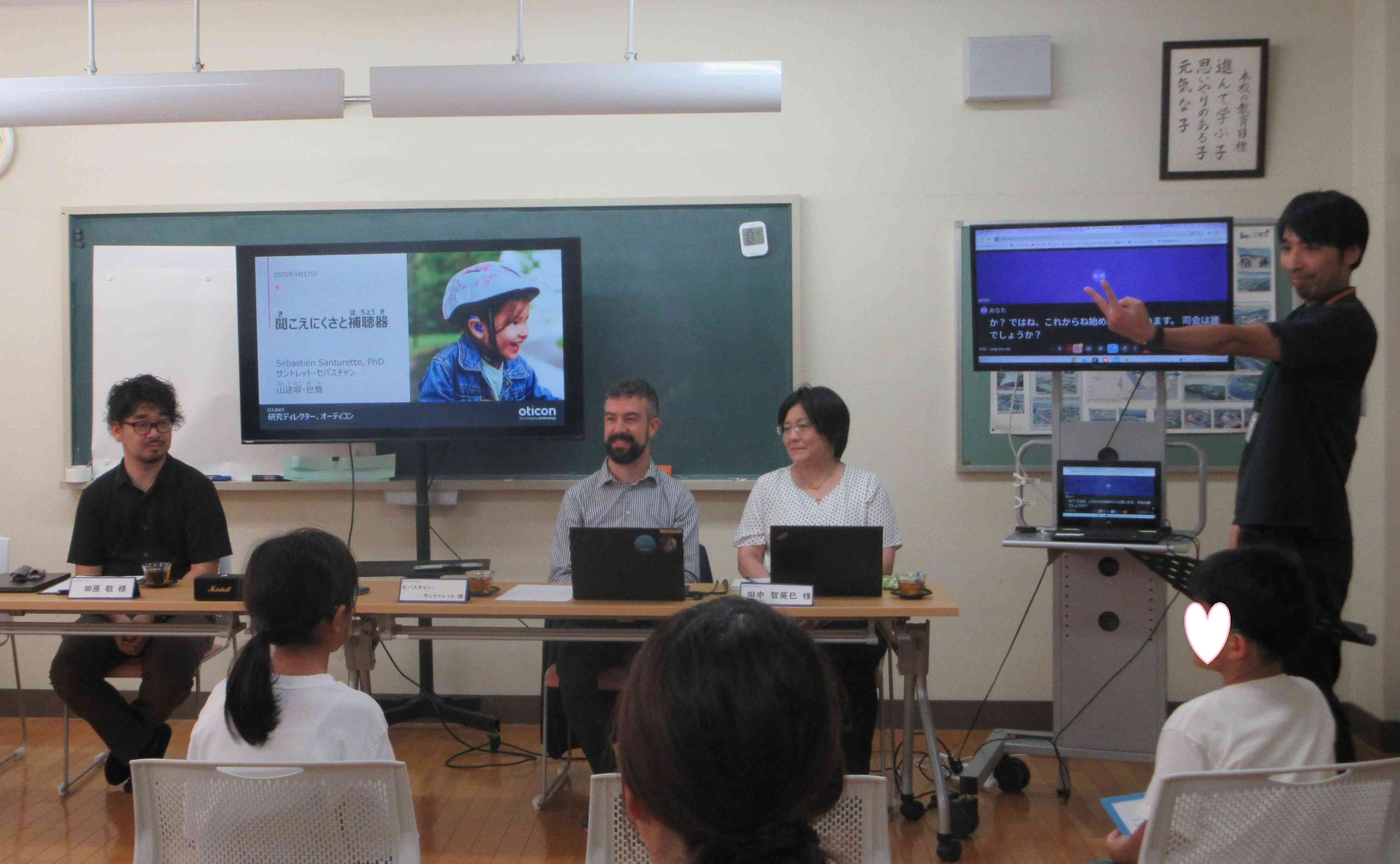 9月17日(水)に、きこえグループ活動を行いました。 今回は、きこえ(難聴)の研究をしている田原敬先生、補聴器の研究をしているセバスチャン・サントゥレット先生をお招きし、一緒に活動しました。先生方からお話を聞いたり、補聴器や人工内耳について質問したりしました。交流活動では、フラフープを使って体を動かしました。