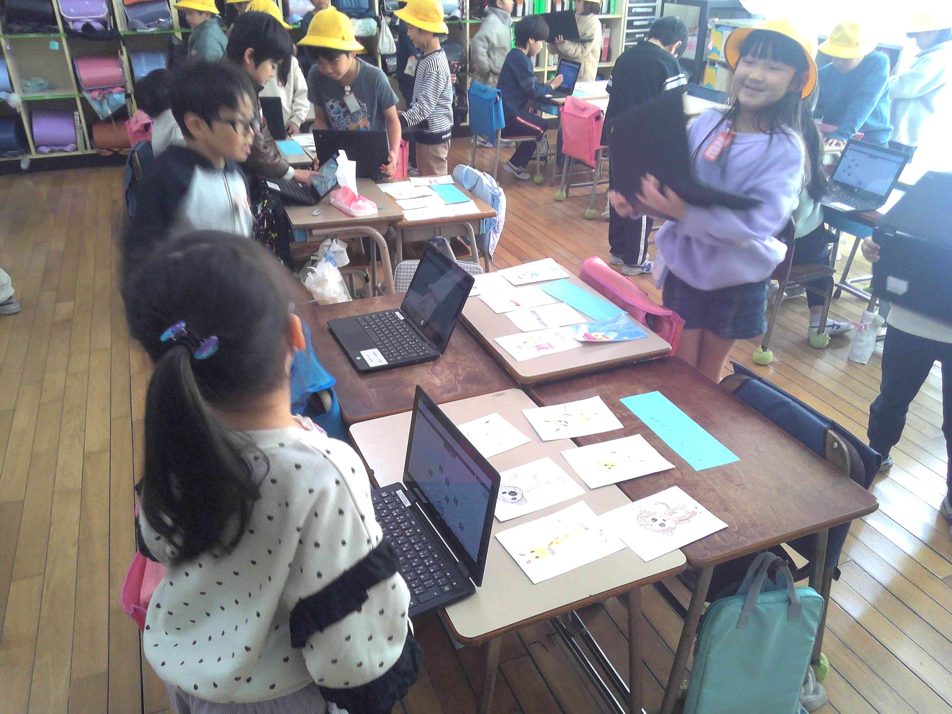 国語の授業では、上位語と下位語の関係を理解する授業をしました。上位語が「さかな」、その下位語が「あじ」「さば」「たい」といった内容でものの名まえを集めて、お店屋さんごっこをしました。 お店屋さんごっこでは、クロムブックを使って、ものの名まえ(果物屋さんだったら、りんご、みかんなど)の絵を描いたカードを写真で撮り、お客さん役の児童にミライシード内のメール機能を使って送る仕組みにしました。子供たちは楽しみながら国語の授業を行うことができました。【添付ファイル】